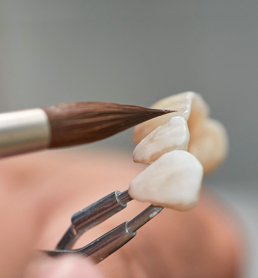 individuell geformt und eingefärbt, sodass Form und Farbe exakt angepasst werden. Die minimalinvasive Präparation der Zähne ermöglicht ein schonendes Vorgehen bei maximaler Stabilität. Das Ergebnis wirkt unauffällig und verleiht den Zähnen langfristige Festigkeit.
